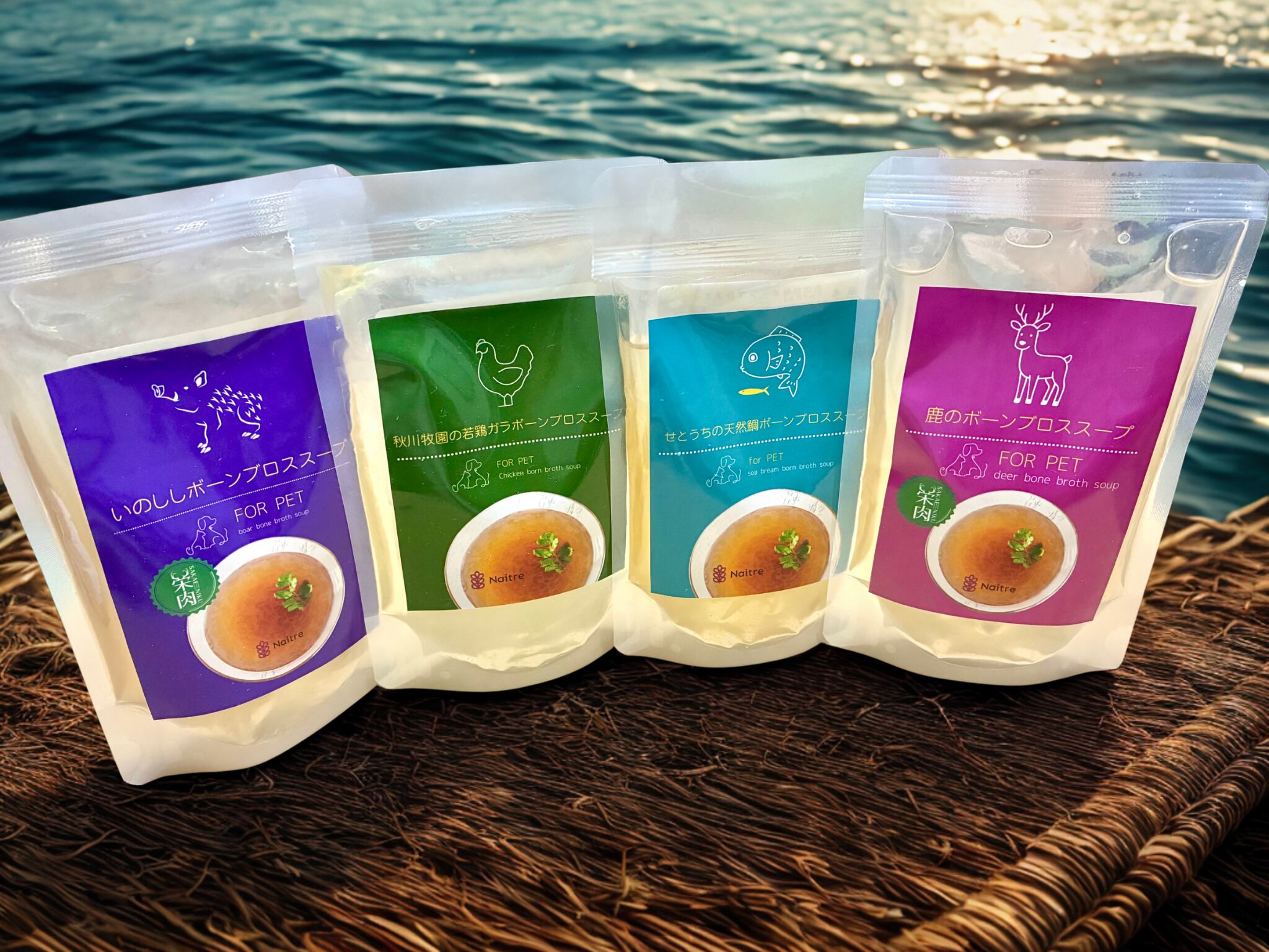せとうちの海で育った天然鯛を使用し、じっくりと煮込まれた栄養満点なスープです。その豊かな旨味と香りが広がり、大切なペットの健康を考える飼い主さんに最適な商品です。スープとしてそのままお楽しみいただけるだけでなく、手作りのペットフードに加えることで、より美味しさと栄養価をプラスできます。添加物を一切使用せず、素材本来の美味しさを最大限に引き出したシンプルな仕上がりが特長です。